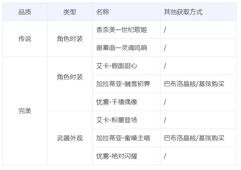 「意识重构—世纪歌姬」限时开放,引航者可以使用「记忆序列」进行复现,有概率获得传说品质角色时装「香奈美—世纪歌姬」、传说品质武器皮肤「谢幕曲—灵魂鸣响」及其他完美品质时装;