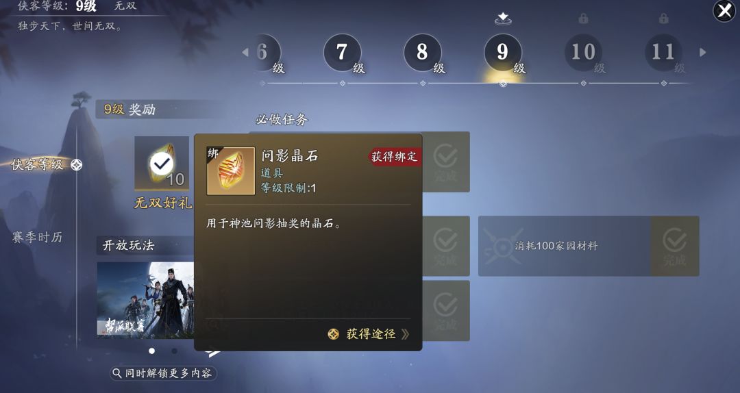 今日侠客等级上线上限9级,开启家园和帮派联赛玩法。可领取10个问影晶石(后续抽穷奇套天衣2.0道具)。