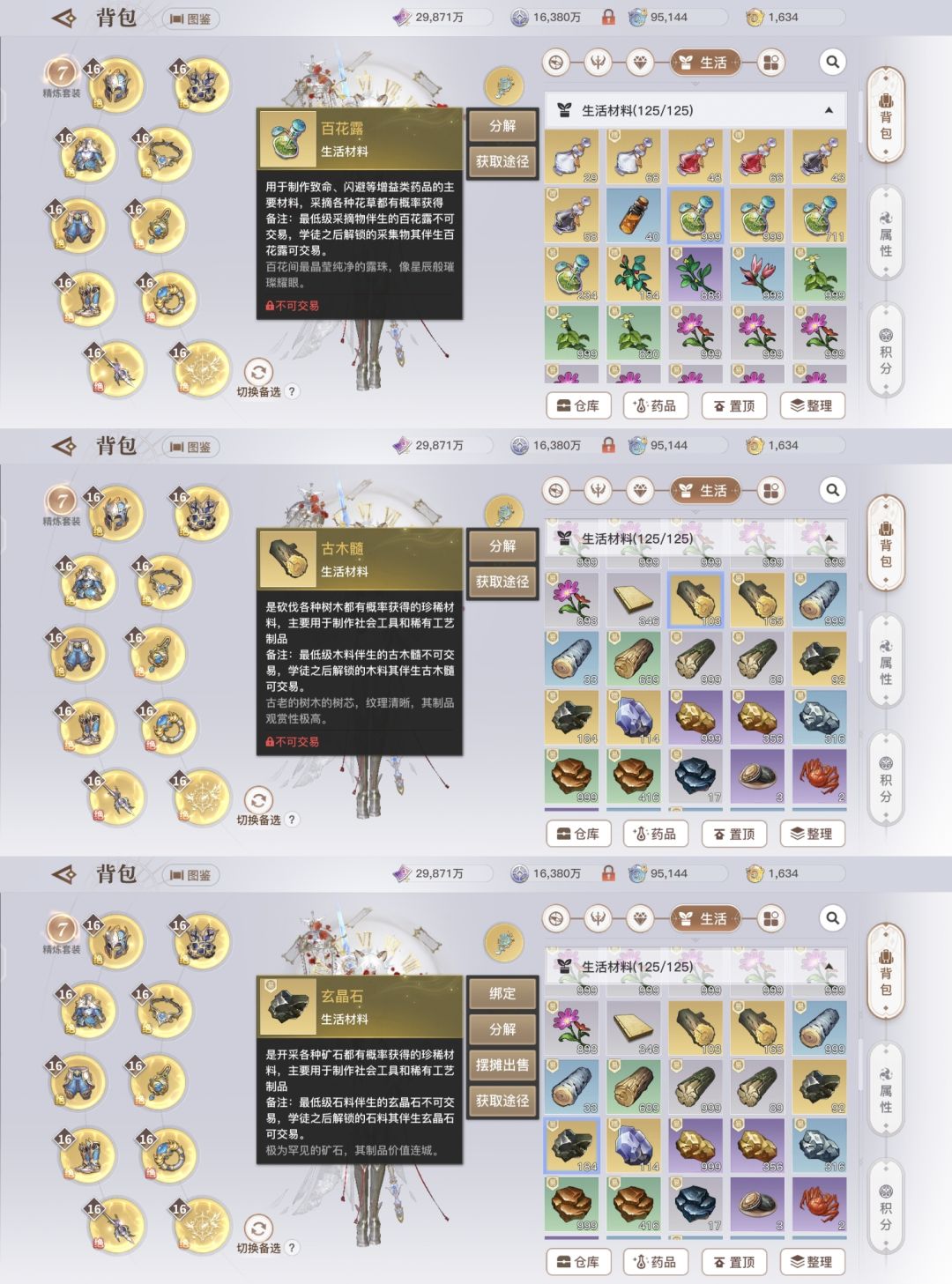 三·在家园的采摘伐木挖矿获得的材料都可以在交易行摆摊售卖,但是要注意(图9)这三类的金色物品最低级的生活技能产出是绑定的,也就是金茸花、迷梦木、特矿石产出的金色物品绑定,其他等级产出的可以交易。