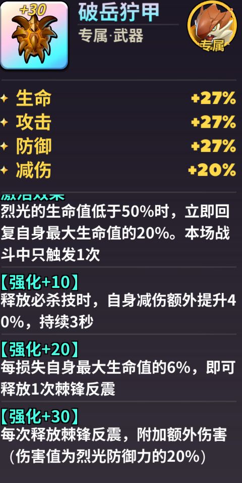 烈光的专属武器,可提升自身生命和减伤! 升级后棘锋反震触发条件降低至6%。完全体更可附加额外伤害!