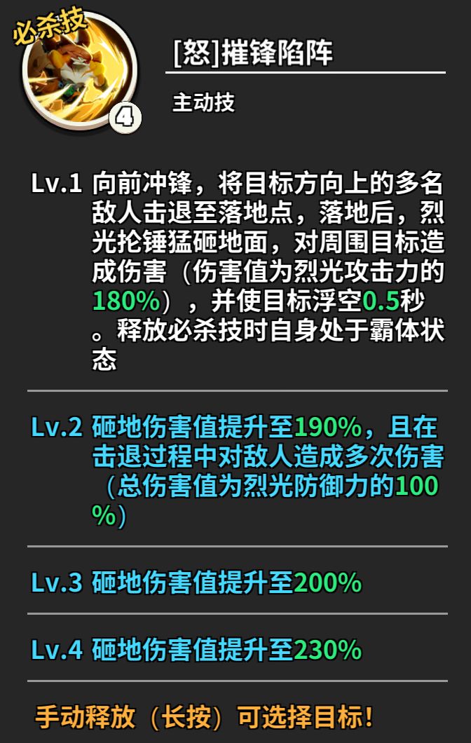 每次战斗他都冲锋在前,释放技能时向前冲锋将目标方向上的多名敌人击退至落地点且附加霸体状态,落地后的猛击对敌人造成大量伤害,并使目标浮空0.5秒,升级后还可在冲锋过程中对敌人造成伤害!