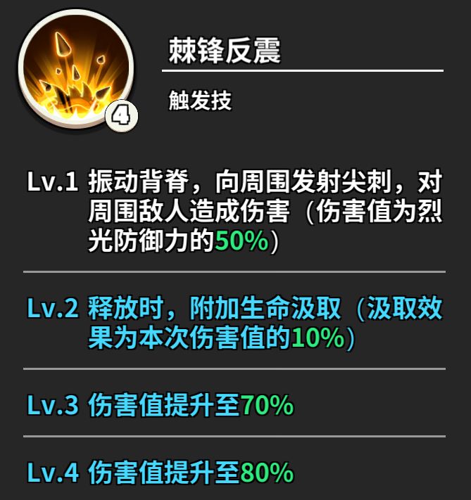释放时,提升自身技能减伤、减伤和防御!同时自身受到伤害时可释放反击尖刺!