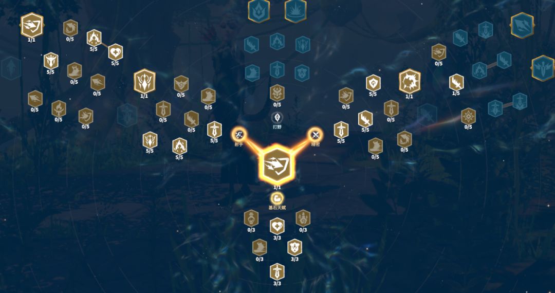 在1-10级时,如图点出如图【基石】天赋树;在11-43级时,依次点出左侧的【射手】天赋树;44级后,如图点出右侧的【精密】天赋树;