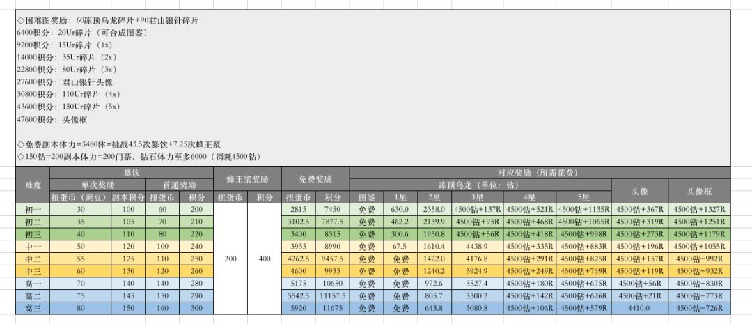 副本各积分奖励(冻顶乌龙、头像、头像框),各难度花费,都做在表格上了,自己看吧~~