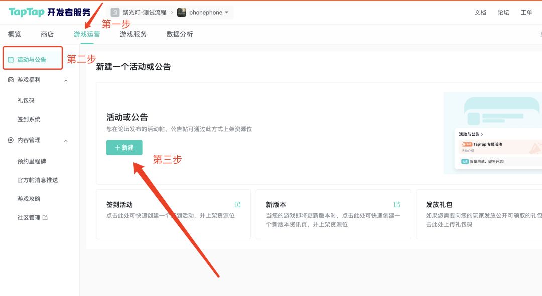 进入开发者中心后台(链接:点击进入),找到你的游戏,点进去。依次点击 游戏运营-活动与公告-新建。