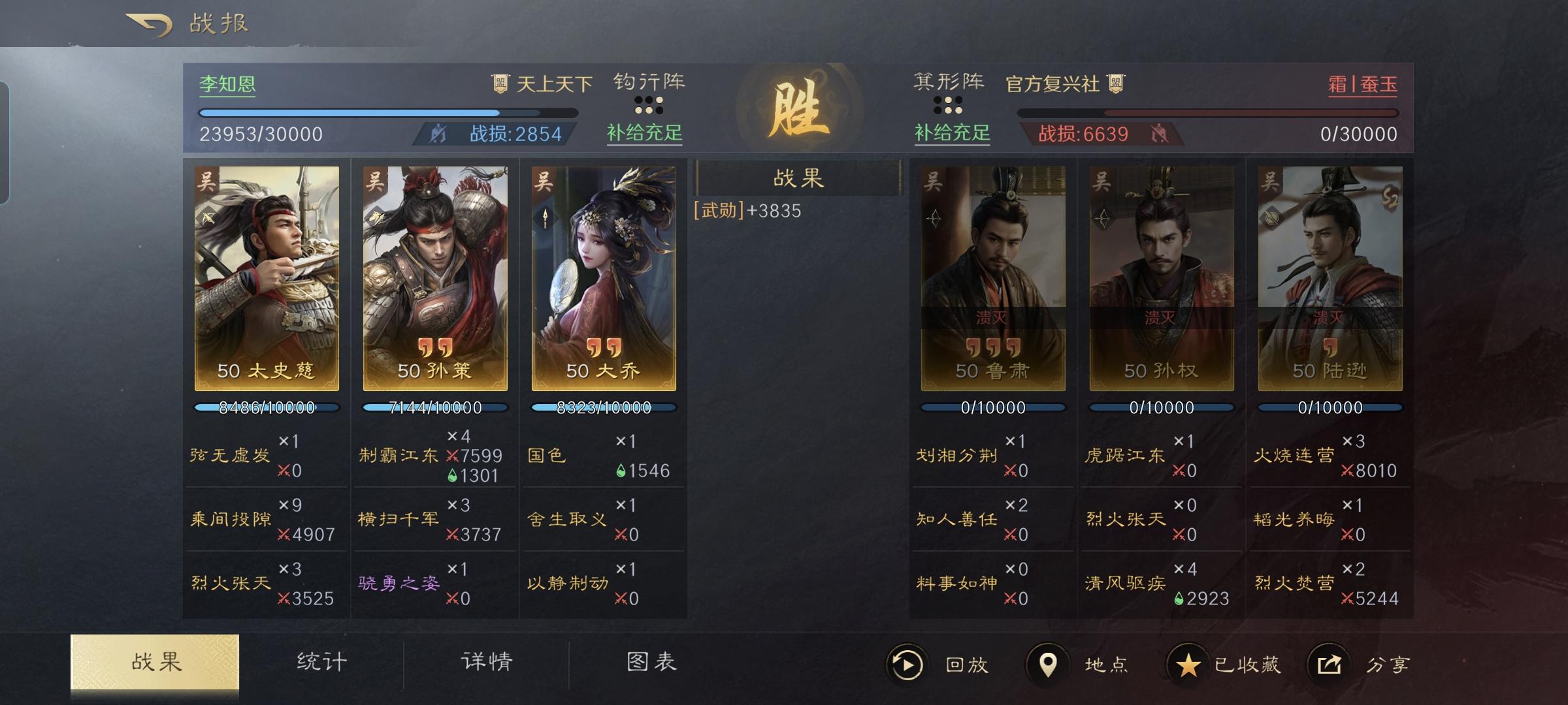 接下来就让我仔细观摩学习一番,太史慈、孙策、大乔的组合是如何形成双核输出,并在三回合之内逼得对面的都督队自焚而亡的。
