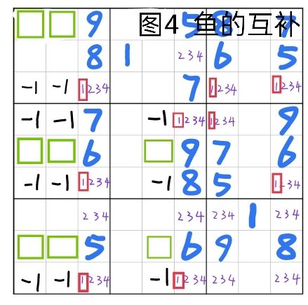 图3是水母的例子,定义域是c3679,鱼身是r3c379/r4c67/r6c39/r9c36的几个格子,删除域是r3469。可以看到c3679中,数字1能填入的格子刚好只处于四行四列。