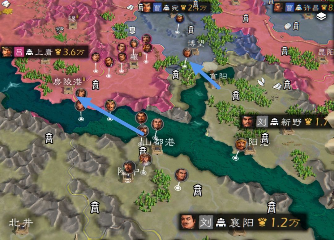 我军攻伐上庸之际,刘表自襄阳和新野调兵支援,新野来兵须过曹军境,曹操派许褚截击援兵以便我军顺利攻克上庸;自襄阳来的援兵欲经山都港走房陵港上岸,奈何上庸无力支撑到援军到来。我军攻克上庸即挥师西进,占房陵据穰城于曹军界修筑长城防线,刘表襄阳援军被阻于房陵水域,水陆攻防战即刻打响!