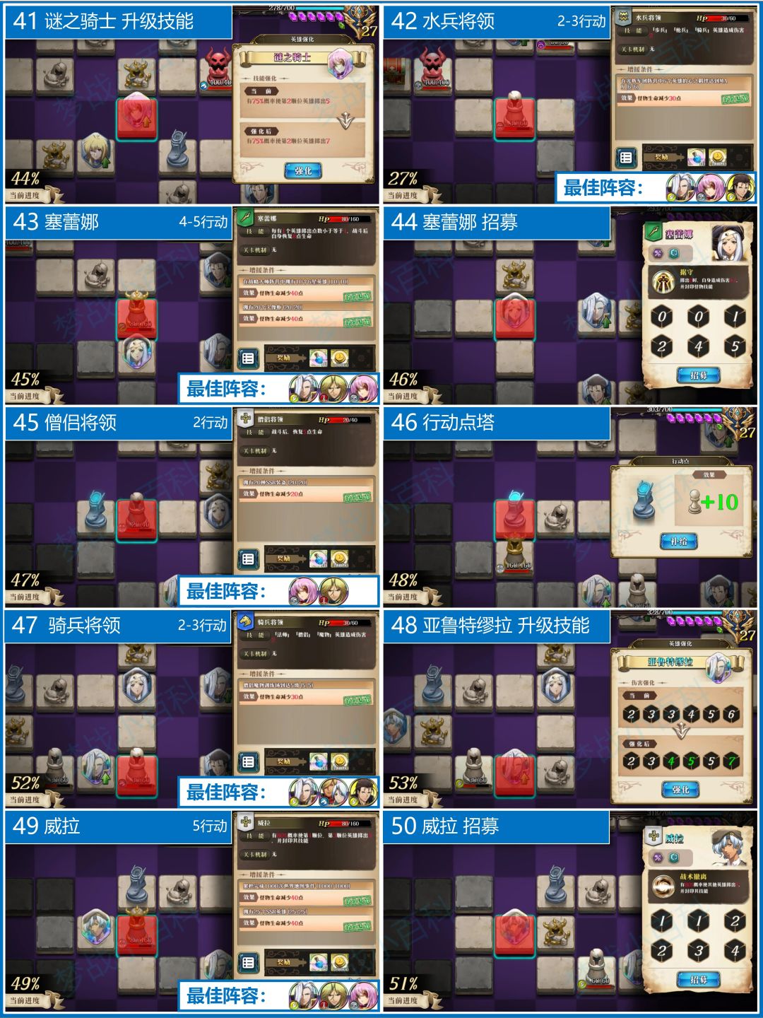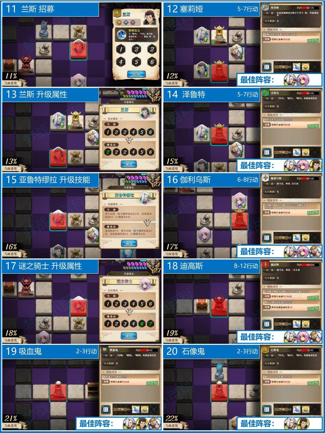 本图是战略阵营图。元帅是第一个输出核心,越打伤害越高。蕾拉适当配合来打伤害。中期谜骑和兰芳特的组合特别猛,是中后期主要输出点。如果遇到厉害的BOSS就上塞蕾娜封印。