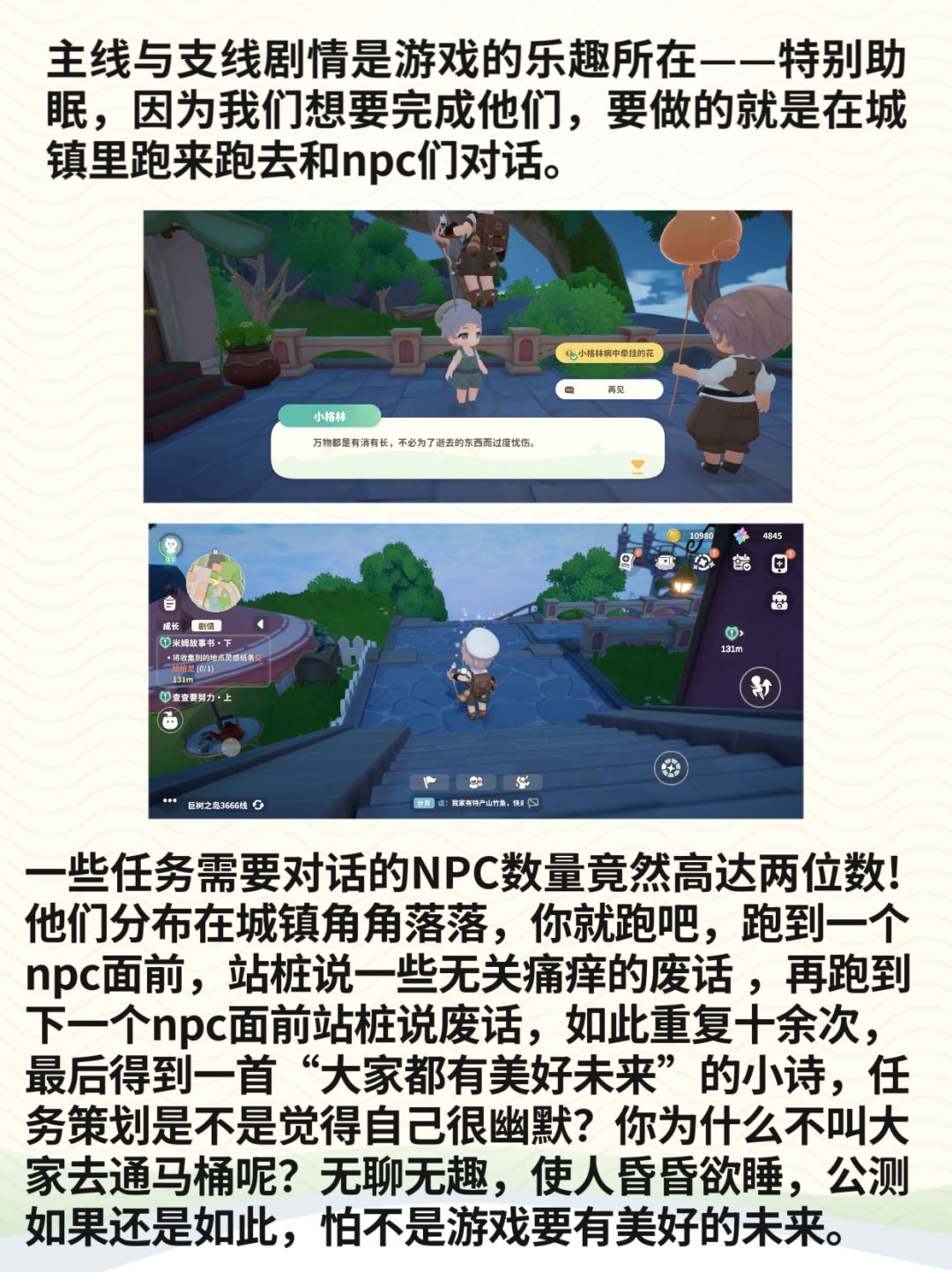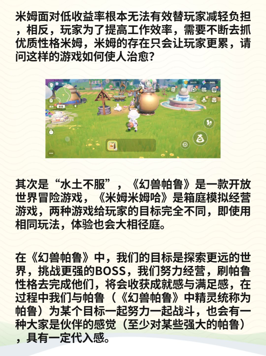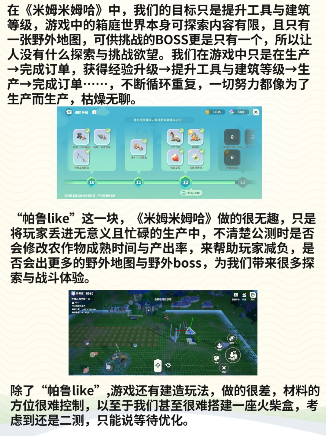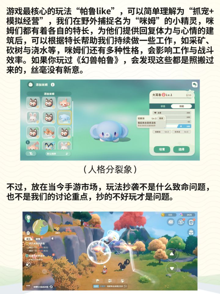 仅从本次二测体验来看,《米姆米姆哈》目前只是一个粗糙的帕鲁like,没有新意没有独特的亮点,更是与简介中描述的梦幻空岛治愈之旅相悖,整款游戏唯一的乐趣就是有助睡眠。