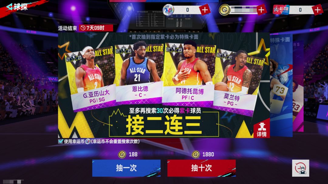 在“接二连三”首次抽取到紫卡阿德托昆博、恩比德、SGA、莫兰特即可获得全明星专属卡面,获得专属卡面后可解锁对应全明星球衣!