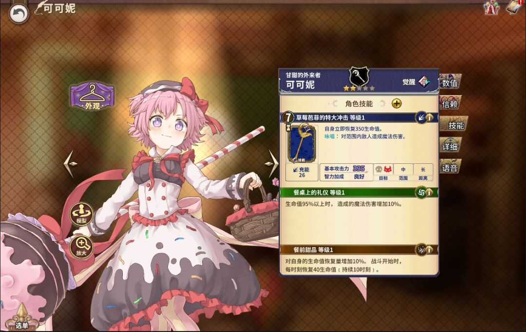 奥义“草莓芭菲的特大冲击”可恢复自身生命值,并对范围内敌人造成魔法伤害。技能“餐桌上的礼仪”让可可妮的生命值在95%以上时,增加造成的魔法伤害(满级增加20%)。技能“餐前甜品”对自身的生命值恢复量增加,并在战斗开始时恢复生命值(满级时恢复量增加15%,每时刻恢复120生命值【持续20时刻】)。