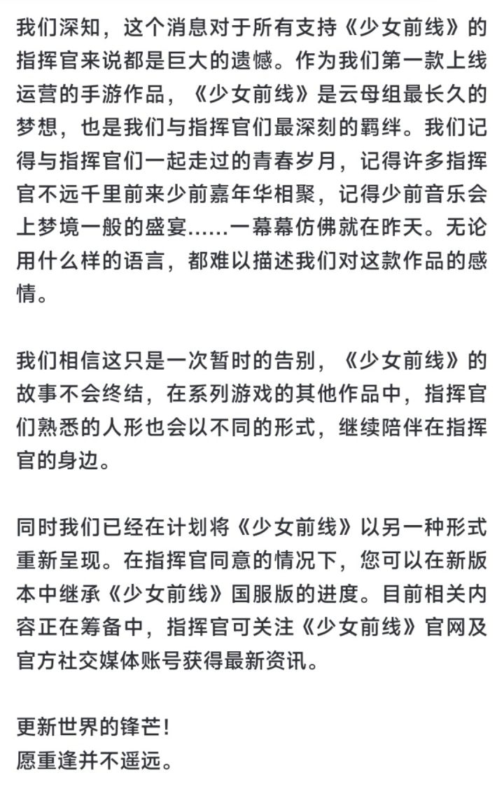 尽管我们一直尽最大努力推进续约,但经过多轮谈判,双方在关键条款上仍未能达成一致,我们不得不接受此决定,将无法继续运营陪伴指挥官八年的《少女前线》国服版本。