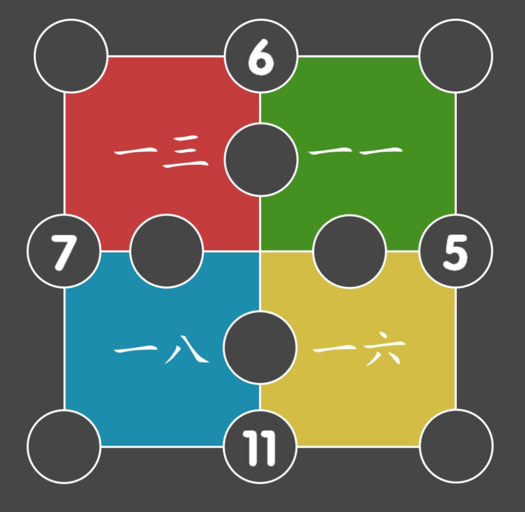 第十四关:如图,对应右上角两个提示,将提示中八个数字填入对应位置后,保证每个小正方形边中圆的和是30,做简易加减法即可得出答案