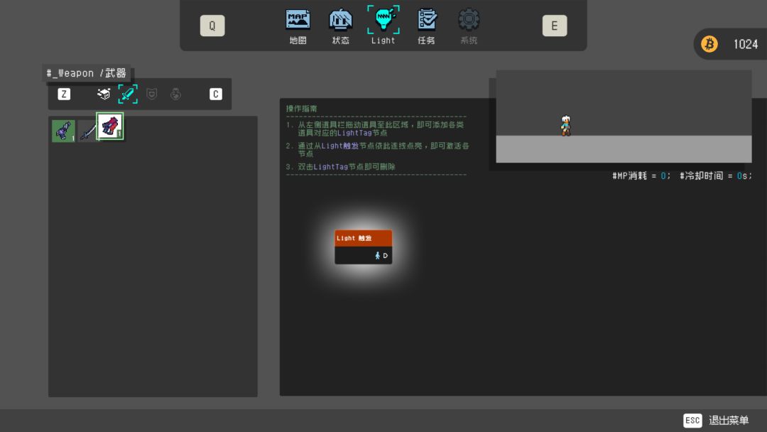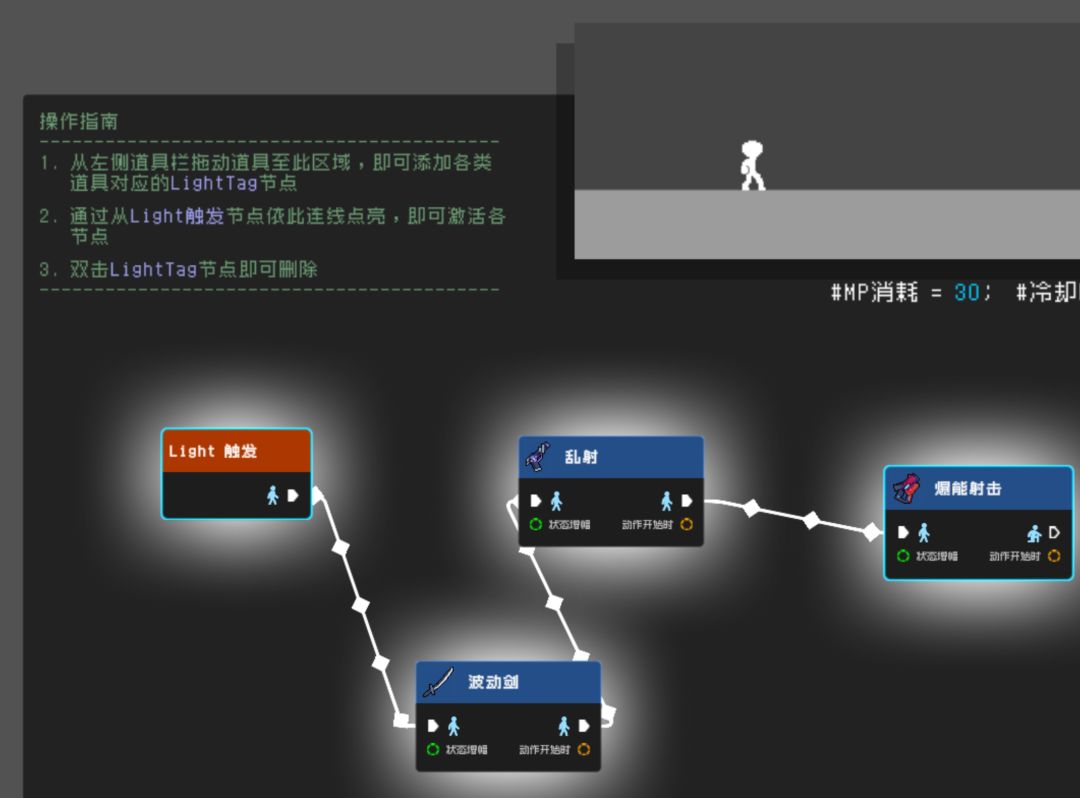 将武器拖动至“Light”面板中,已触发为起点将技能自由连接在一起