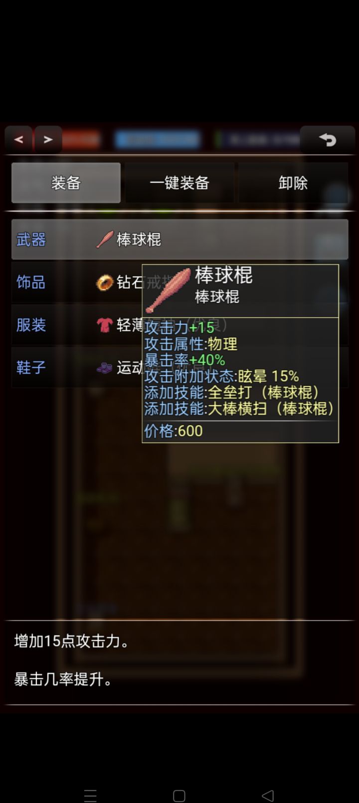 棒球棒自带40%暴击率15%眩晕概率,攻击力15只比优秀斧子低一点,打高级怪可以靠完美闪避和屏气凝神技能实现无限闪避和高概率暴击。并且因为棒球棒有群攻技能,搭配起来高速公路的群体怪也能秒。