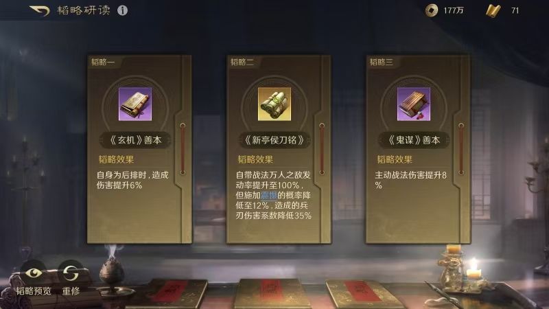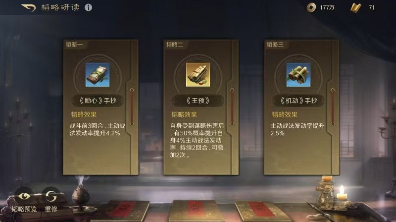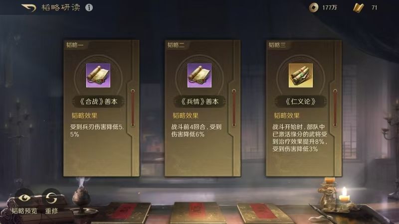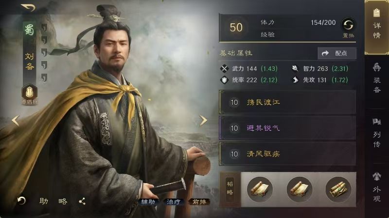 刘备战法:携民渡江+避其锐气+清风驱疾。韬略库:合战善本+兵情善本+仁义论(专属)。重盾兵特性不屈,专精点亮屹然不动。