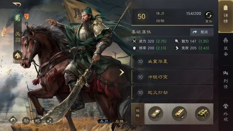 关羽战法:威震华夏+冲锐巧变+趁火打劫。韬略库:励新手抄+王预(专属)+机动手抄。重骑兵特性坚韧,专精点亮骁勇善战。其他细节就没什么专门可说的了,老玩家们一看便知。这里最大的亮点,就是让张飞带了火羽,然后关羽习得趁火打劫。张飞在三国谋定天下里的先攻值,是比关羽要略高一些的,只有这么安排,他们哥俩才能不浪费任何一次混乱对手的机会。
