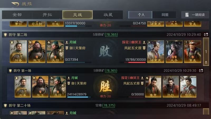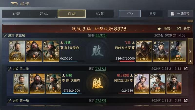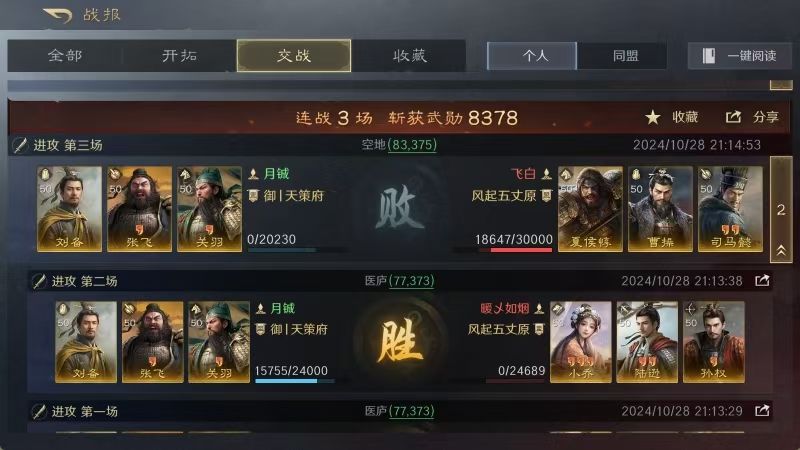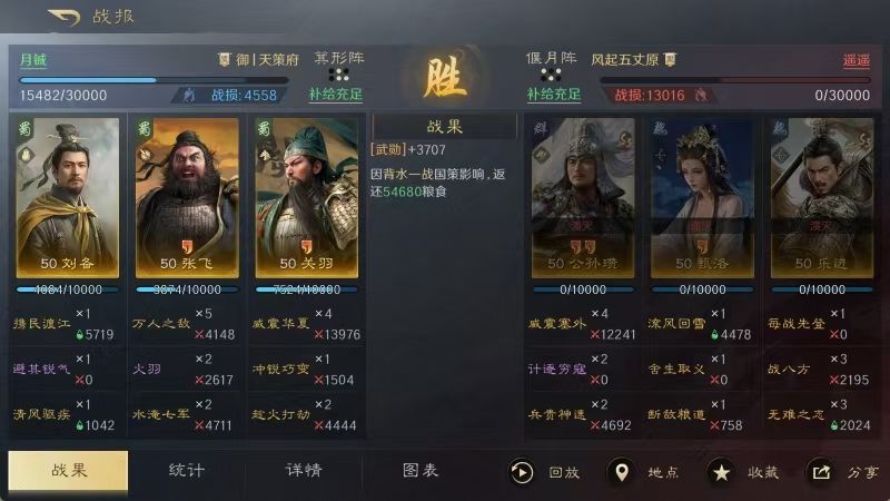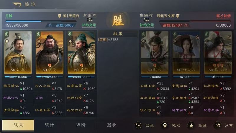 如此这般行云流水的配置,使得关羽在成功发动6次威震华夏的同时,也触发了6次趁火打劫,令对面的赵云、甘夫人和马云騄彻底乱成了一锅粥。关羽、张飞打出了高额伤害,刘备创造了高额治疗,此战的胜利自然水到渠成。