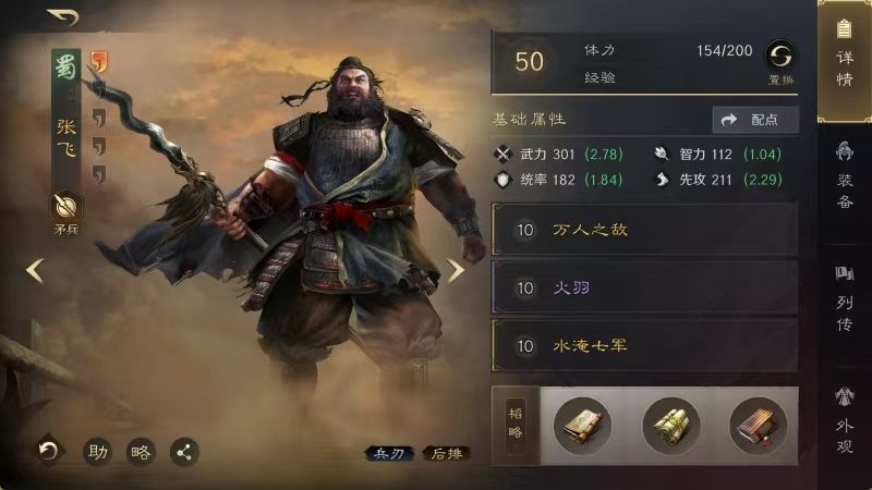 张飞战法:万人之敌+火羽+水淹七军。韬略库:玄机善本+新亭侯刀铭(专属)+鬼谋善本。矛兵特性鏖战,专精点亮负坚执锐。