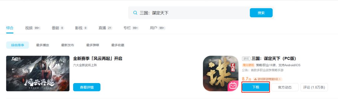 方式一:可前往哔哩哔哩官网:https://www.bilibili.com/,搜索“三国:谋定天下”,点击“三国:谋定天下(PC版)”下方的“下载”按钮,即可下载到《三国:谋定天下》官服PC端启动器。