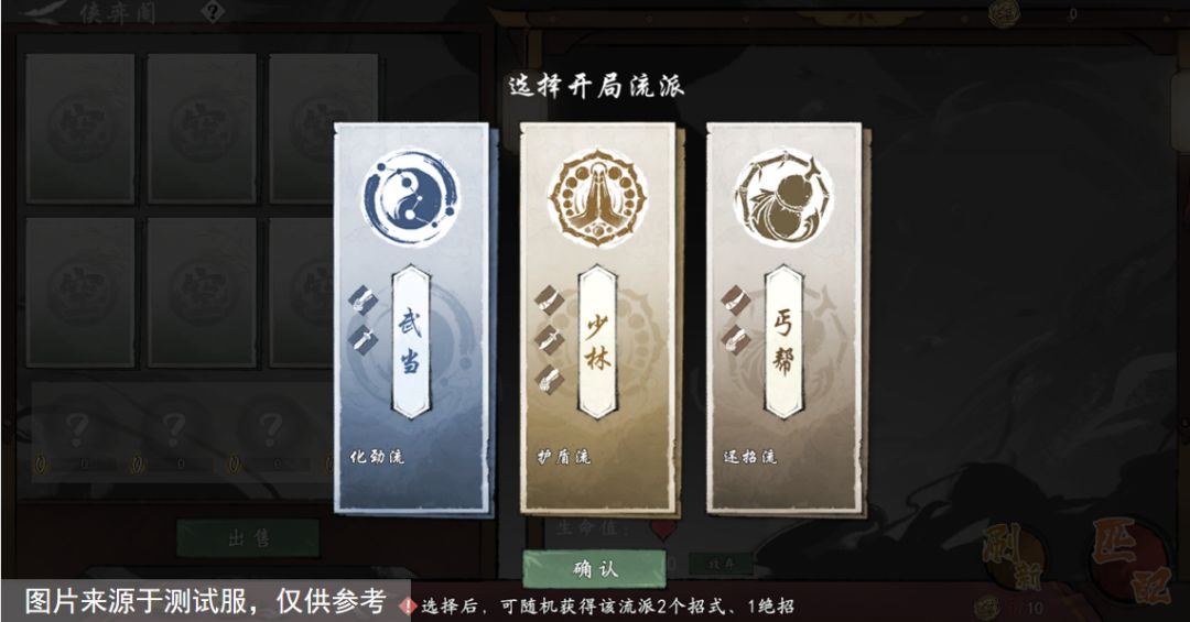 4)所有少侠进入玩法后,需从3个初始武学流派中选择一个,根据选择的流派,少侠可随机获得该流派的武学并进行装配,装配完成后,少侠将开启一轮挑战;