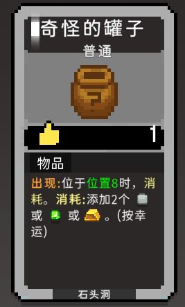 更改【奇怪的罐子】,掉落按照幸运来出现【石头】【宝石】【金块】。
