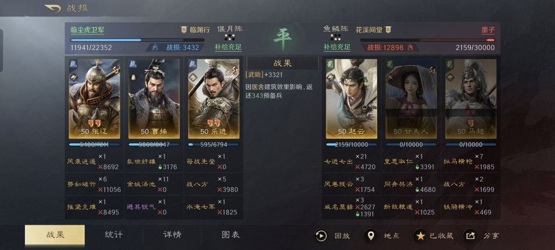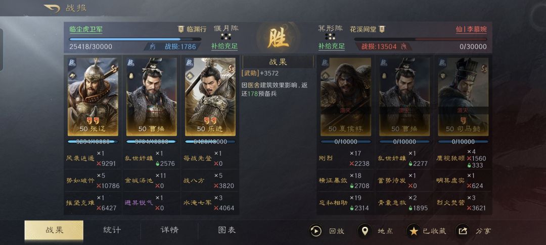 特别鸣谢游戏ID名为“临尘虎卫军”的玩家朋友,给本文提供了宝贵的创作素材。临尘虎卫军利用麾下的张辽、乐进和曹操摆出偃月阵,屡屡都是在半场时间节点,就击溃了强大主流战队阵容。如果你的手头恰巧同时拥有张辽和乐进,那真得好好看看下文段落的复盘。