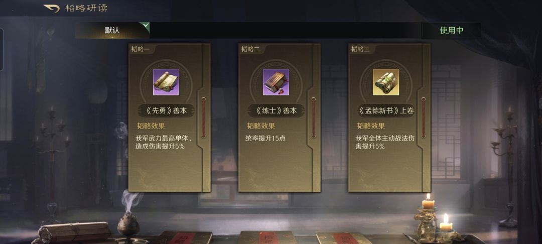 曹操战法:乱世奸雄+金城汤池+避其锐气。韬略库:先勇善本+练士善本+孟德新书上卷(专属)。重盾兵特性不屈,专精点亮屹然不动。