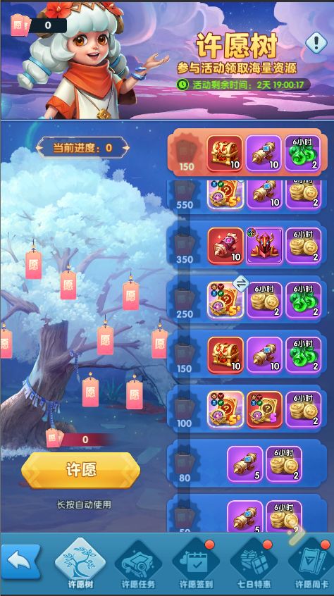活动期间,可以消耗许愿福袋增加许愿进度,完成对应阶段时可以获得阶段奖励。达到一定进度,有机会获得四系S+英雄/圣物自选卡大奖哦!