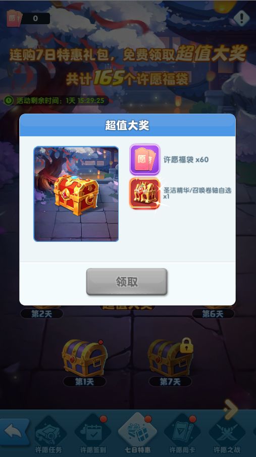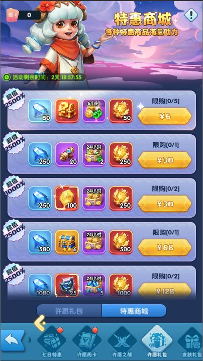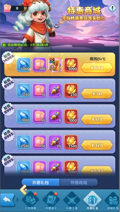 活动期间,开放许愿礼包和特惠礼包的购买。