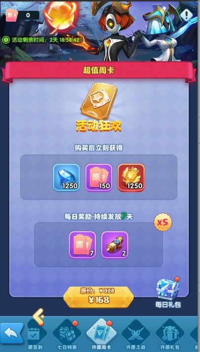 活动期间,开放许愿周卡购买,购买周卡可以获得大量奖励。