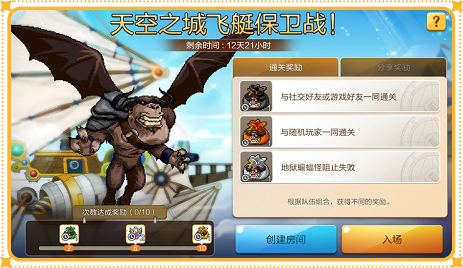 快来与好友或其他冒险家击败地狱蝙蝠怪,一起守卫天空之城飞艇吧!