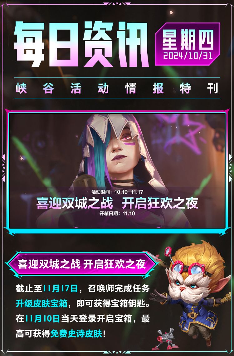 截止至11月17日,召唤师完成任务获取能量,即可提升战斗之夜皮肤宝箱等级,更有龙魂水晶好礼等你来拿。11月10日当天登录即可开启宝箱,最高可获得史诗皮肤!