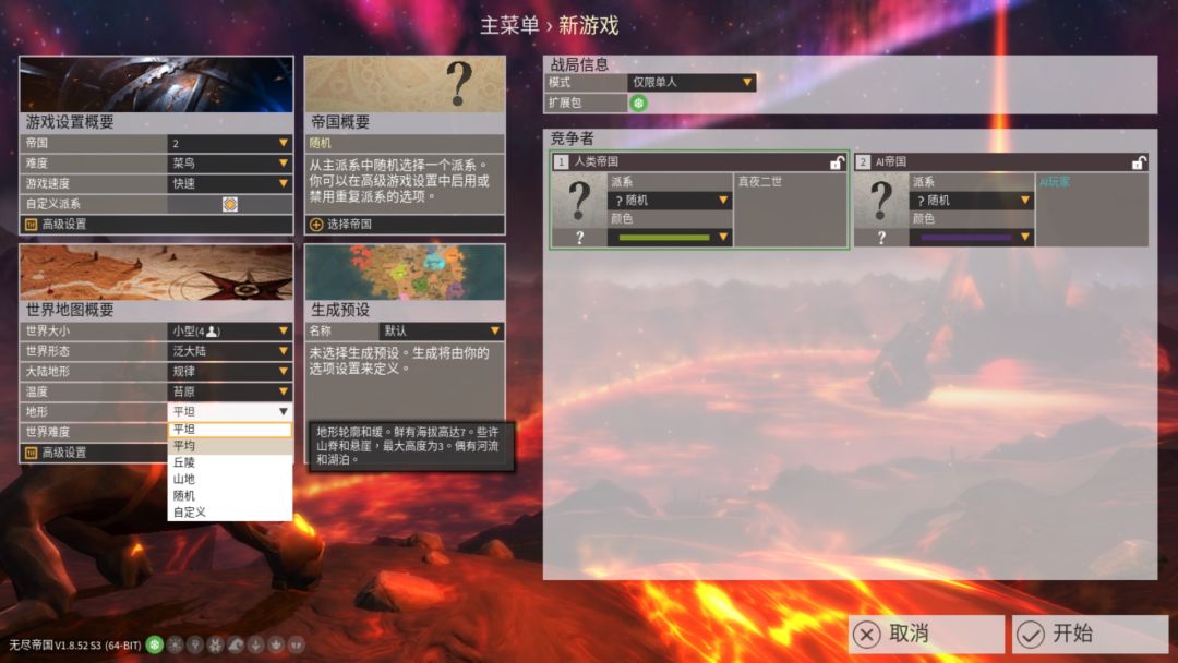 看游戏这些地图设定,能随机出成千上万……无数张不同地图,就跟帝国和文明6的随机地图一样。这些地形基本囊括了全陆(内陆)、大陆、沿海、高地丘陵、大岛、小岛等主要地形。——当然,实在要说有缺少,就是缺少地中海地形(中间一坨海陆地围一圈)和绿洲地形(大部分资源都集中在中间绿洲一带)。