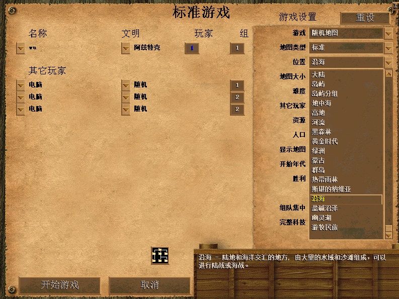 除了随机地形,还能制定资源多寡、季节气候(影响粮食)、地势高度,甚至还有高级选项设置更多未知地图!我就是喜欢这种随机地图,探索未知领域,始终对世界有一种好奇感。不像维多利亚、三国志、信野、星际冰峰等游戏那样,地图都规定死了的。(虽说像星际冰峰这些地形和资源绝对平衡的,可以保证游戏的竞技公平性,但我想玩单机呢?)