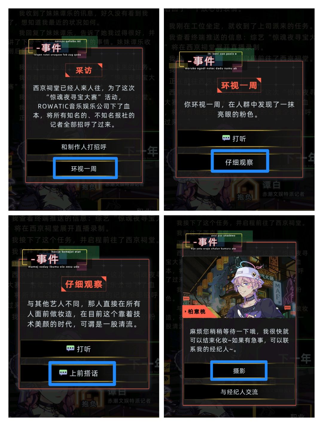 接完任务去了西京祠堂之后,支线1最重要的就是要选“打听”,然后遇到危机一定要“上前帮忙”,之后选一些安慰他的选项,出来之后每年柏意桃都会来找你玩,全部答应;支线2最重要的是要选“仔细观察”-“上前搭话”-“摄影”-“查看跑来的方向”-“联络经纪人”,第二年经纪人会带着柏意桃来找你交朋友,选“超激动的”,就可以了。