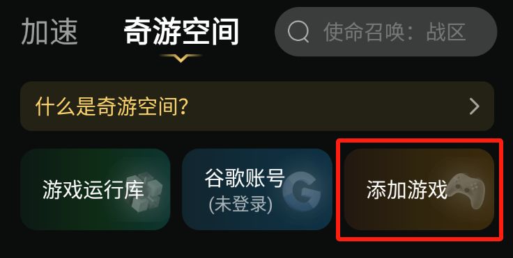 第二步:奇游空间内选择添加游戏(首次使用奇游空间需要完成空间相关文件配置)