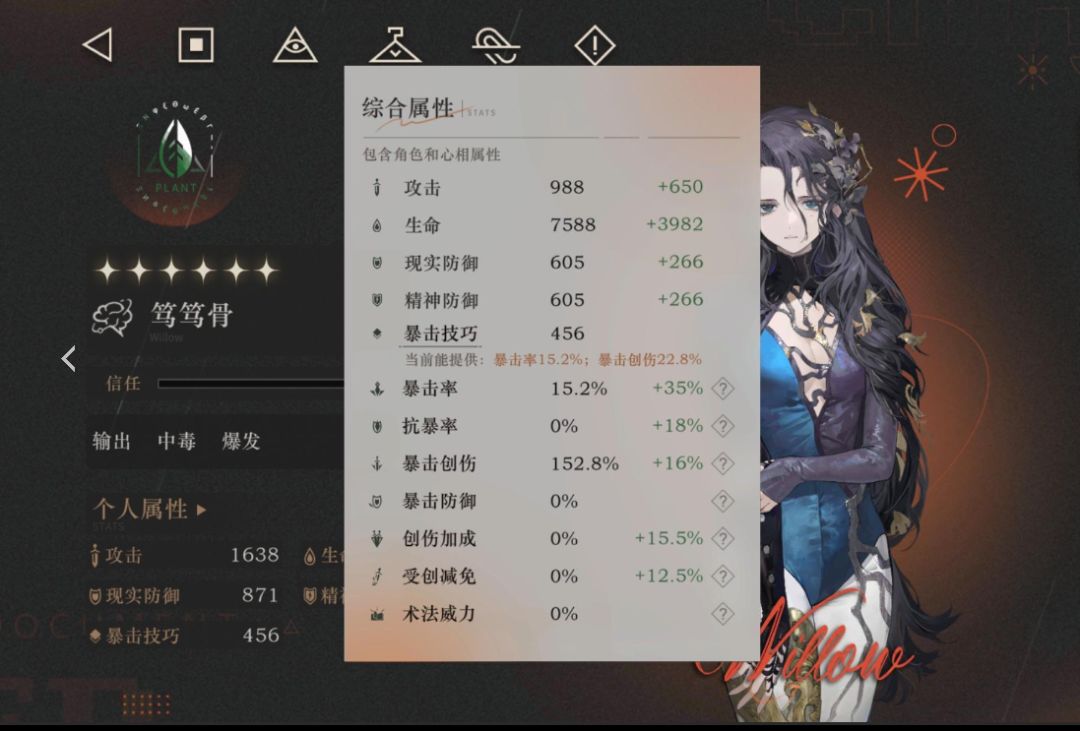 说了这么多,我们还是来看看这位新角色的具体情况吧。按照惯例,先上图。这是我自己的笃笃骨,练度为36010,专武已满级,调频尚未开启。笃笃骨的基础数值有点令人失望,但暴击率勉强及格。而其最大的问题是基础攻击力只有222,这实在是太低了。满级时攻击力也仅有988。作为一个只能依靠攻击力转化为真伤输出的角色,在新版本中面对苏芙的87治疗率加成,攻击力却被排到六星倒数,生存属性却被提升得很好,真是让人困惑。她难道是怕死吗?作为大C角色,笃笃骨的定位并不是辅助,而是作为毒C来输出。基础面板给到辅助是好事,但放在输出角色身上,这样的配置无疑是致命的。
