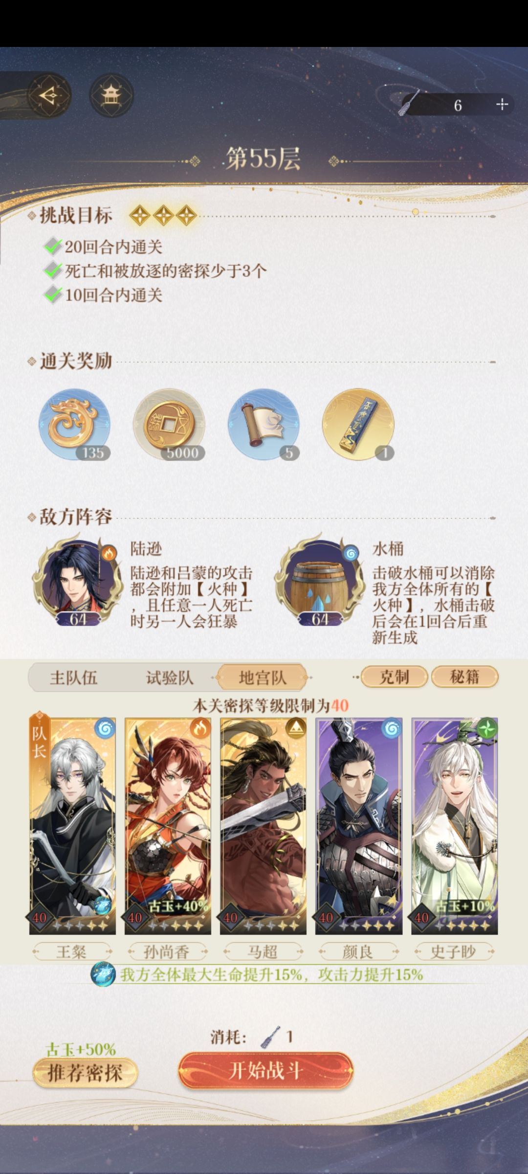 ②55就得看下脸,火种不能太密集在一个角色身上,水桶只能让它刷新一次,采取了陆逊最后一次大招回合直接打挂,同回合颜良开大把他献祭给吕蒙,之后就简单了,重点是水桶血量要压低不然吕蒙挂了它还在又收不了就很尴尬![[表情_裂开]](https://img.tapimg.com/market/images/164f9c5ffd8d861aa20ba60bbdb4147f.png)