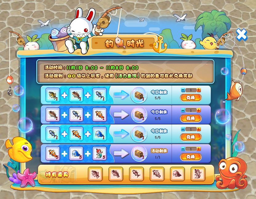 一定数量和种类的鱼可以用来兑换活动宝箱,《希望OL》钓鱼时光活动宝箱可以开出各种药水和道具,还有几率开出钓鱼时光活动限定称号梦境河钓客。