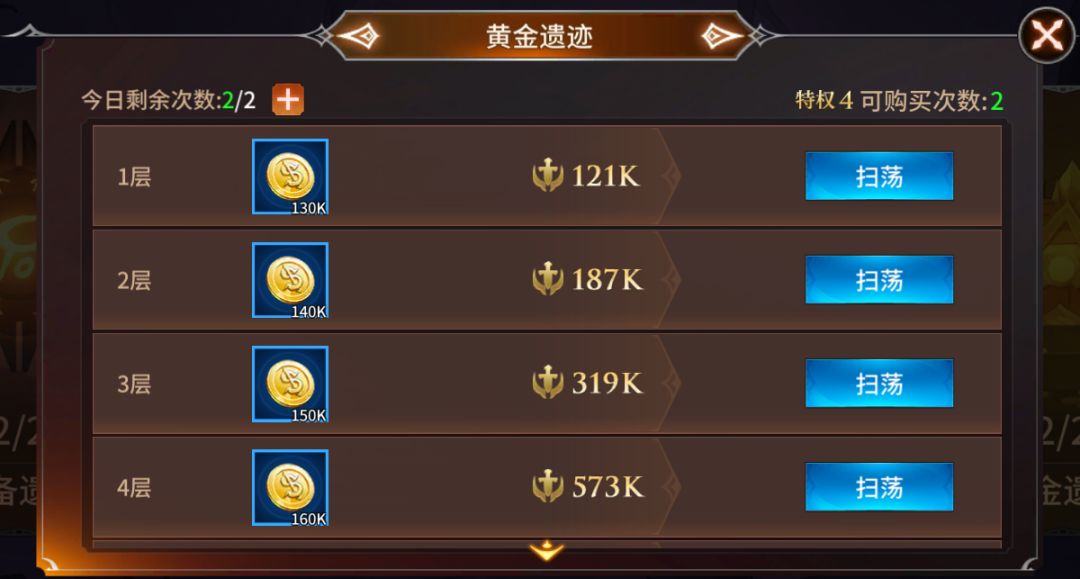 - 黄金遗迹:随着契约者们拯救大陆的脚步,当契约者们通关120关后,即可开启遗迹副本,每日通关黄金遗迹副本可获得大量金币奖励,金币副本的等级也会随之契约者的战力进行提升,战力越高副本奖励越丰富