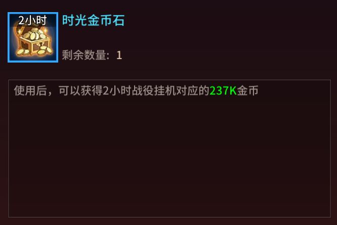 - 金币道具:游戏中有特殊获得金币的道具,该道具可通过关卡副本,活动兑换,商店购买等途径进行获取,最常见的就是2小时挂机金币,金币获取的数量与当前通关的关卡挂钩