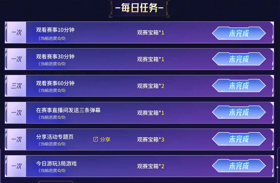 4、规则:10/30/60观赛时间,包括发弹幕和分享赛事页面,都会获得10个左右的箱子。