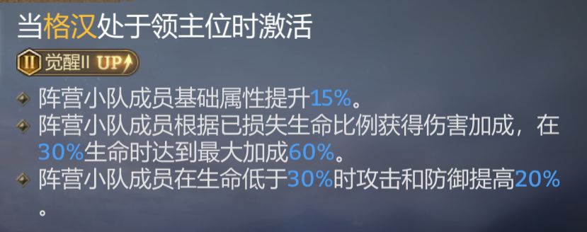 在阵营小队成员30%生命值时可提供60%的增伤(损失生命比例越多、增伤越高),并且攻击、防御可额外提升20%,多乘区增伤使这个阵营拥有极致的爆发。这个阵营不同于噩梦议会,要基于阵营上场人数提供攻速加成,只要领主技激活(领主上阵)就能提供相应效果,很适合作为挂件使用来打伤害。