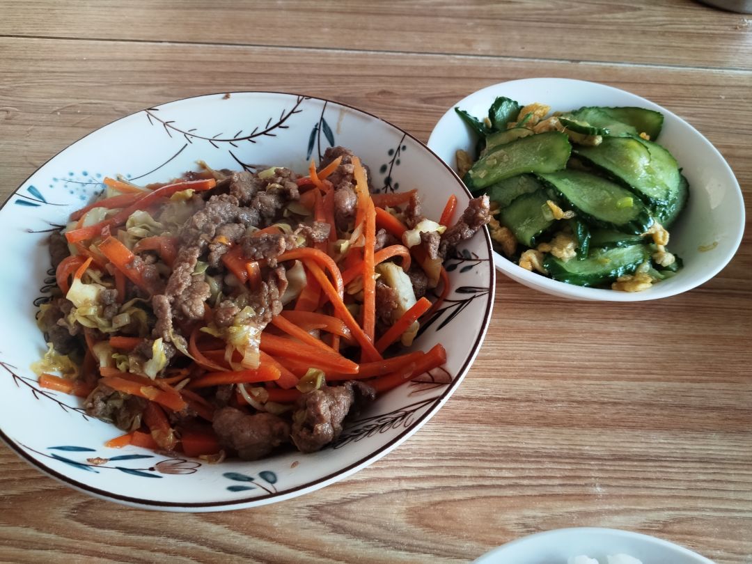 半个大头菜(包菜)切丝,胡萝卜切丝,在里脊收汁的时候下,炒断生出锅