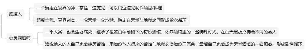 根据以上几个关键词的提取,我们架构了一个以“用光调酒”为核心玩法的模拟经营游戏,玩家将以一名“摆渡人”的身份在忘川酒馆里为形形色色的“亡魂”调酒,并聆听每一位顾客生前的故事。