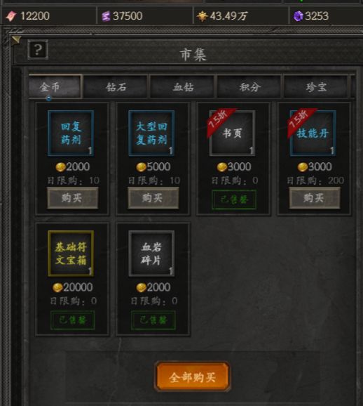 金币商店:书页、符文(金币充足再买)、血岩碎片(金币充足再买)