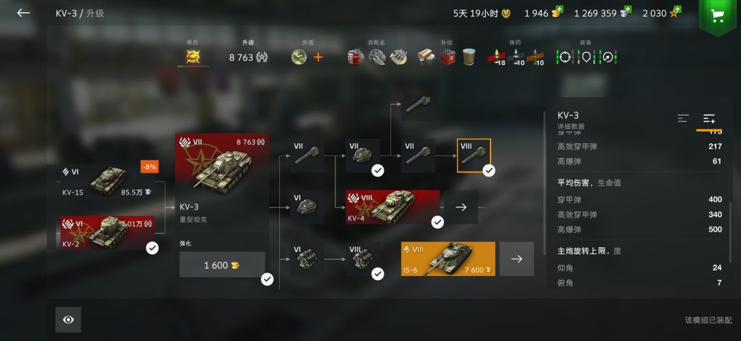 KV3与同级IS不同的是KV3有7度俯角,IS完全体只有6度,多一度的俯角就意味着你能不会受地形的影响而看着自己的俯角过低而打不到对面。
