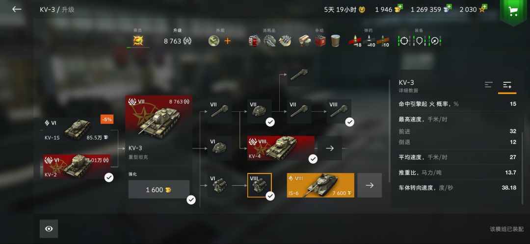 如果你获得了KV3,那么你可以庆幸一下自己获得了KV系列最好机动的战车,在满配之后KV3的推重比为13.7,均速为27km/h,自转为38度;你可能觉得这机动在7级重坦里面一般,但是确是在KV系列里面机动最好的一个。